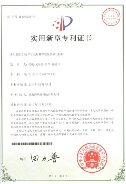 - VOC及甲醛釋放量檢測氣候箱專利證書